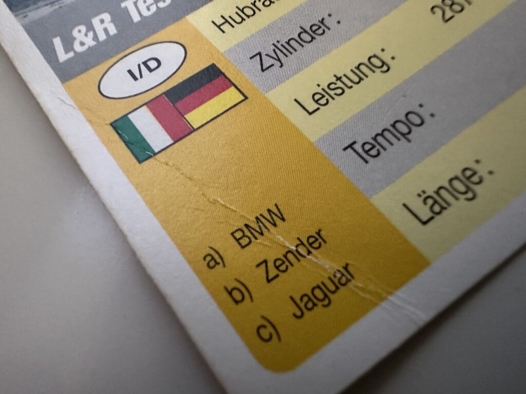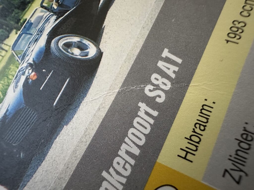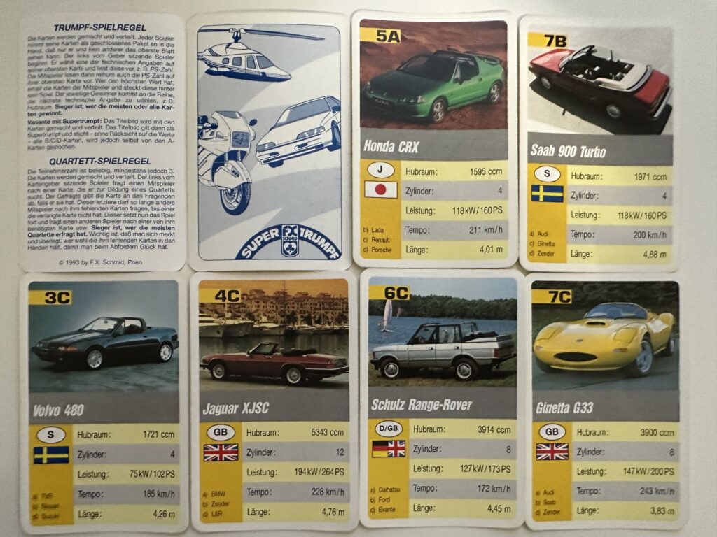 Quartett Cabrios aus dem Jahr 1993 (laut Deckblatt) mit dunkler Rückseite. Quartett ist komplett (32 Blatt + Deckblatt). Box ist vorhanden kann aber nicht original und gebrochen sein. Der Zustand ist so naja. Keine Beschriftungen oder größere Flecken, dafür einige Knicke. Die Bilder zeigen nur einige Knicke. Es gibt auch Karten mit Knicken an den Ecken. Eine Karte hat auf der Rückseite einen kleinen Fleck. Zusatzkarten sind keine vorhanden.